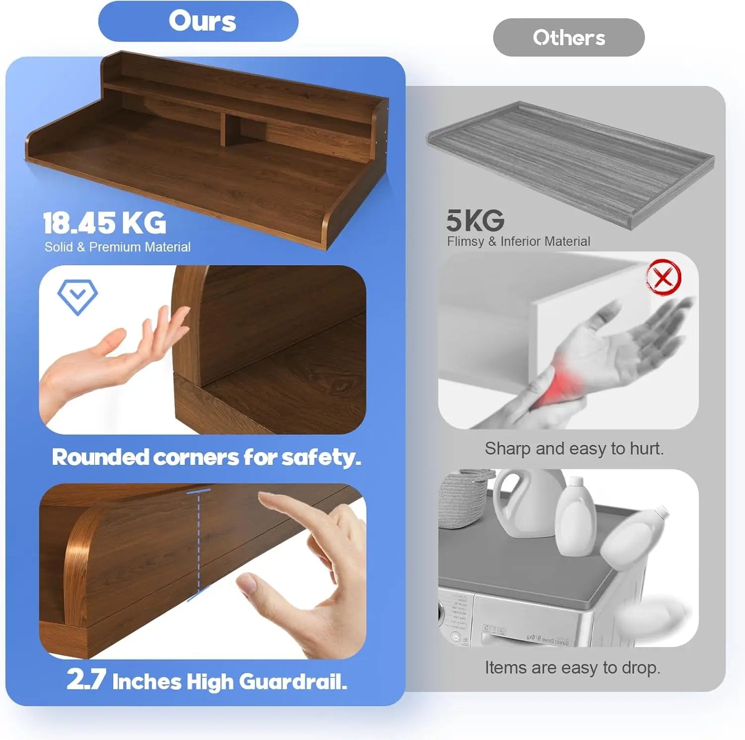 - 【2.75"High Protective Railings】Washer dryer countertop has 2.75"high railings on three sides to keep items from falling through the gap, especially small ones like socks.The edge of the guardrail adopts a smooth arc design to avoid injuries caused by sharp corners, making it safer to use.