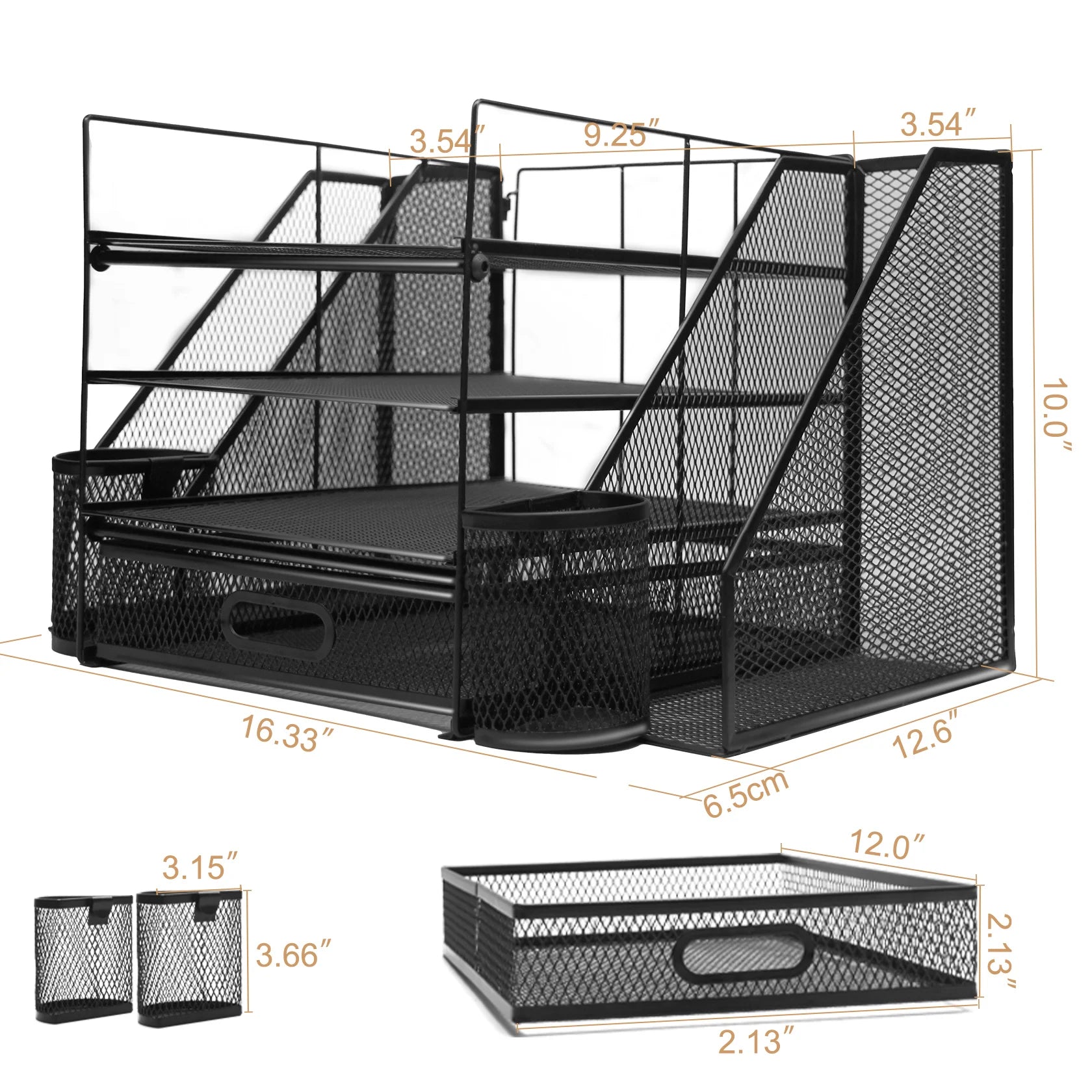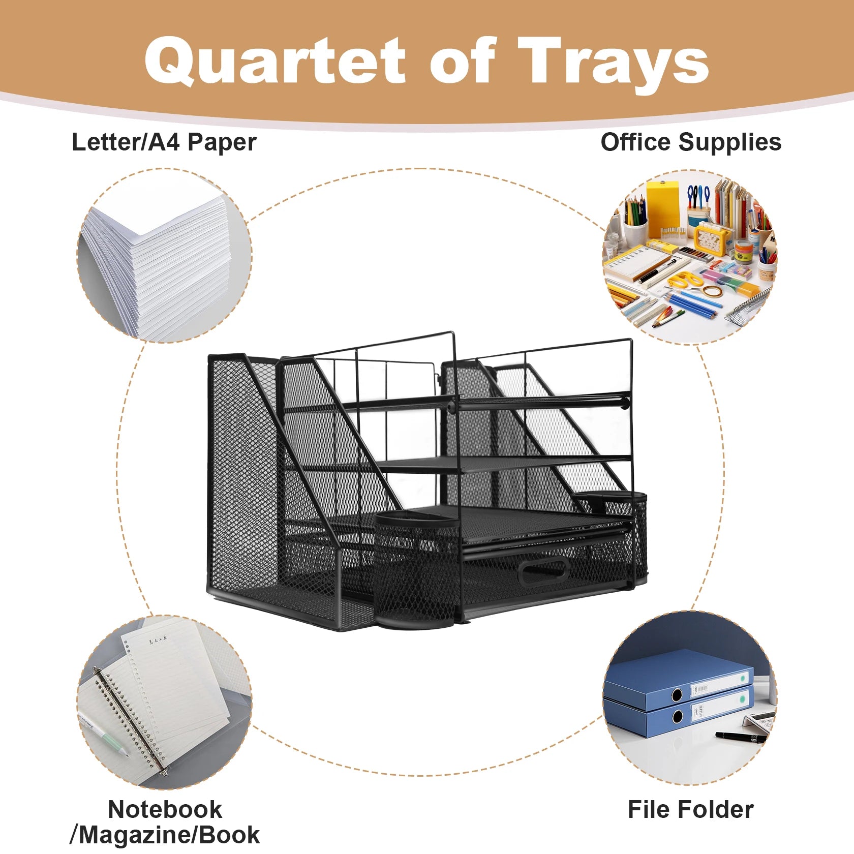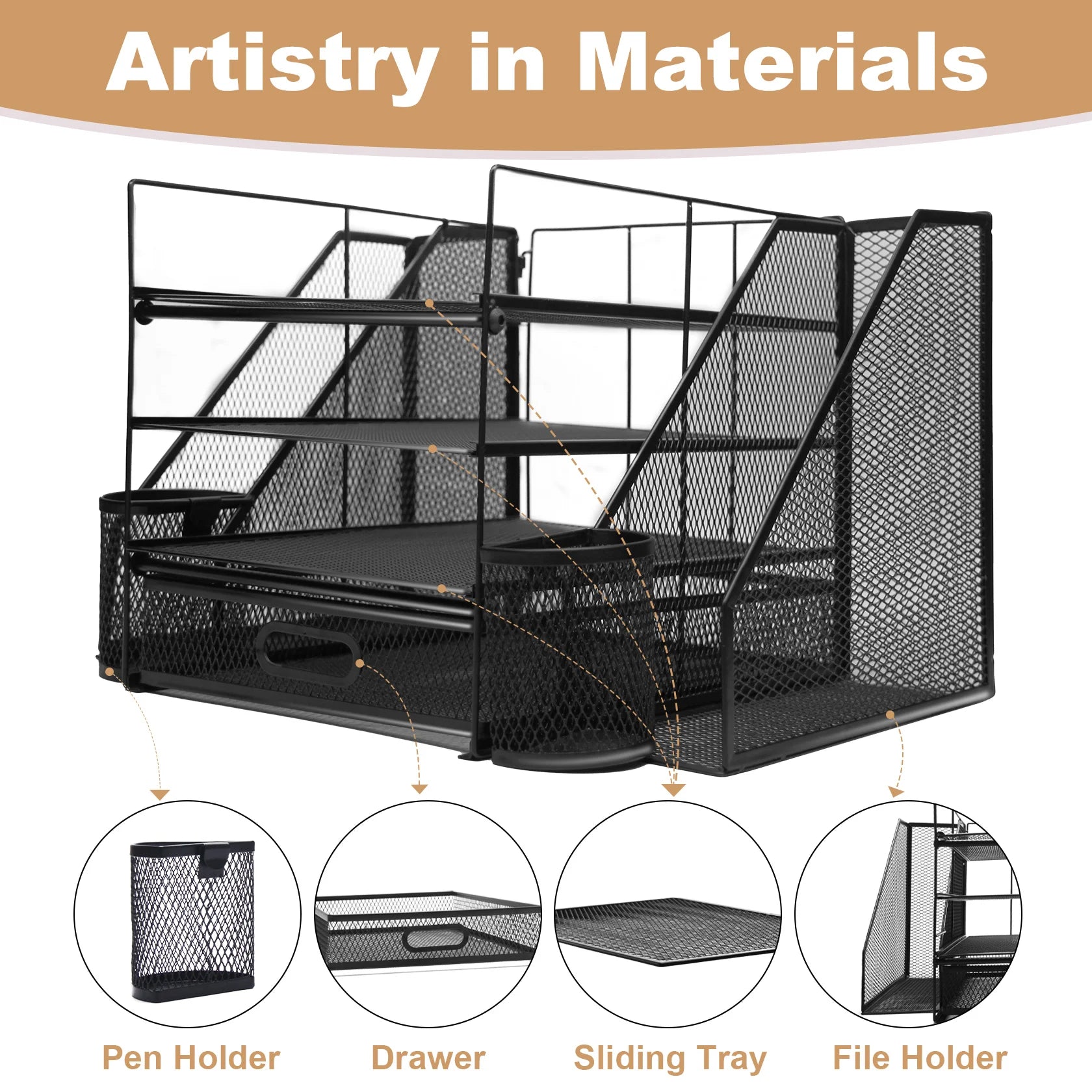 Transform your workspace with our Office Desk Organizer and Accessories, designed for those who value organization and efficiency. This large capacity desktop organizer features a 4 tray file organizer with a convenient drawer and two dedicated pen holders, making it the perfect solution for both school and home settings.